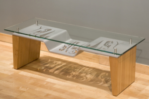 Description: This solid alder and anodized aluminum glide coffee table designed by Sabina Hill features Kwakiutl artist Steve Smith 's Eagle and Raven motifs; these birds of power and prestige are a source of inspiration. The table is part of a limited edition: 8/25.