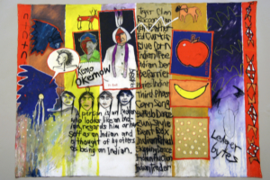 | Item: 19 Artist: Gerald McMaster Title: Crossfire of Identity Date: 1993 Medium: Acrylic, graphite on unstretched canvas Size: 72 ½” x 100” Biography: Gerald McMaster is a Cree artist, art historian, and curator, who has held major posts at the Canadian Museum of Civilization; the Museum of the American Indian, Smithsonian Institute; and is now Curator of Canadian Art at the Art Gallery of Ontario. Donor: Gerald McMaster Estimated value: $15,000