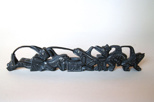 Description: The story of the panel pipe is told by the Raven and the Raven: the elements of Earth - represented by the Eagle, Killer Whale, and Wasco (Sea Wolf) - are protecting Earth's greatest treasure, the Salmon. The sign of the Salmon appears on the box held by the two Frogs. The pipe warns that if the Frogs disappear, so will the Salmon. This panel pipe is intricately carved out of a single piece of argillite.