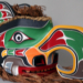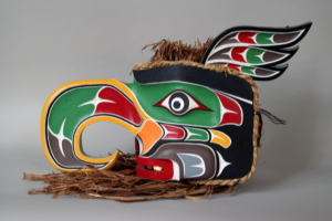 | Item: 3 Artist: Leonard Scow Title: Kolus Date: 2005 Size: 30" height x 24" width x 9" depth Medium: red cedar with cedar bark and acrylic paint Description: This Kwagiutl dance mask depicts Kolus, a supernatural bird and brother of the Thunderbird. Kolus is described in myth as being covered in white down that causes him to overheat. In order to cool down, he can remove the coat of down to reveal his human image. Biography: Leonard Snow comes from a family of well-known Kwagiulth carvers. While he produces limited edition and original prints, woodcarving is his favourite medium. He began carving in 1992, under the guidance of Wayne Alfred. Donor: Lattimer Gallery Estimated value: $3, 000
