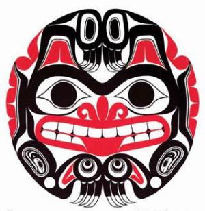 The male grizzly bear was a favourite image of Bill Reid, and he used it in his jewelry designs and sculpture. The round image of Xhuwaji / Haida Grizzly Bear symbolizes strength and shows the grizzly bear in the traditional Haida colours of red and black. The bear�s large flaring nostrils attest to its fierce character and the protruding tongue symbolizes the oral nature of the Haida people.
