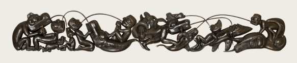From left to right, the mythic creatures -- clutching, hanging on with the mouth, and squeezed in curious positions -- are:
